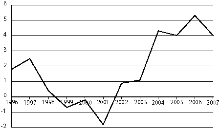 Figur 3.1 Utvikling i netto driftsresultat 1996-2007 for fylkeskommunene utenom Oslo. I prosent av driftsinntektene.