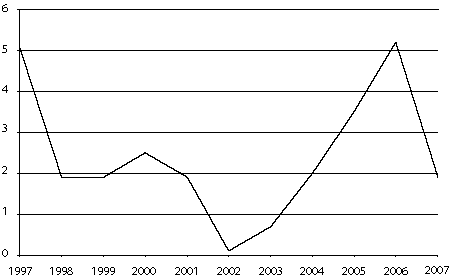 Figur 3.3 Utviklingen i netto driftsresultat 1997-2007 for kommunene. I prosent av driftsinntektene.