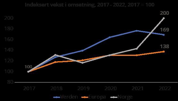 Den globale spillindustrien har opplevd en kraftig vekst de siste årene. I Europa har veksten vært noe svakere, men heller ikke her ubetydelig. I Norge har man sett stor variasjon i samlet omsetning fra år til år, men totalt sett har det vært en betydelig vekst gjennom perioden, langt høyere enn hva man har observert i verden og Europa. Økningen er spesielt positiv sammenlignet med de siste bransjetallene på verdensbasis, der omsetningen sank fra 2021 til 2022. Ekstra positiv er den norske veksten sett i lys av at man også har opplevd kraftig vekst fra 2019. Den norske økningen har sammenheng med at flere selskap er inkludert i statistikken i perioden.