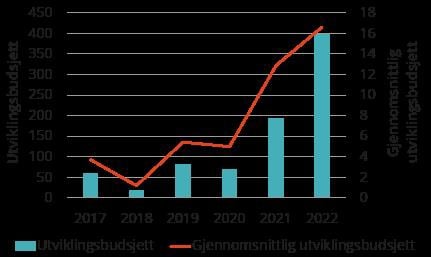 Størrelsen på utviklingsbudsjettene til norske dataspill gir en indikasjon på volumet til spillene som er under utvikling, og størrelsen på prosjektene som finansieres i spillbransjen. Utviklingsbudsjettene til norske dataspill har hatt en betydelig vekst de to siste årene. Veksten sammenfaller med bransjens internasjonale vekst i forbindelse med covid-19-pandemien og en økt profesjonalisering av norsk dataspillbransje. Veksten kan også ha sammenheng med en betydelig statlig satsing på området, som blant annet inkluderer økte bevilgninger til tilskudd til utvikling av dataspill og innføring av en ny forskrift om tilskudd til utvikling, lansering og formidling av dataspill, som blant annet har vektlagt prosjektenes størrelse, kompleksitet og budsjett i søknadsvurderingen.
