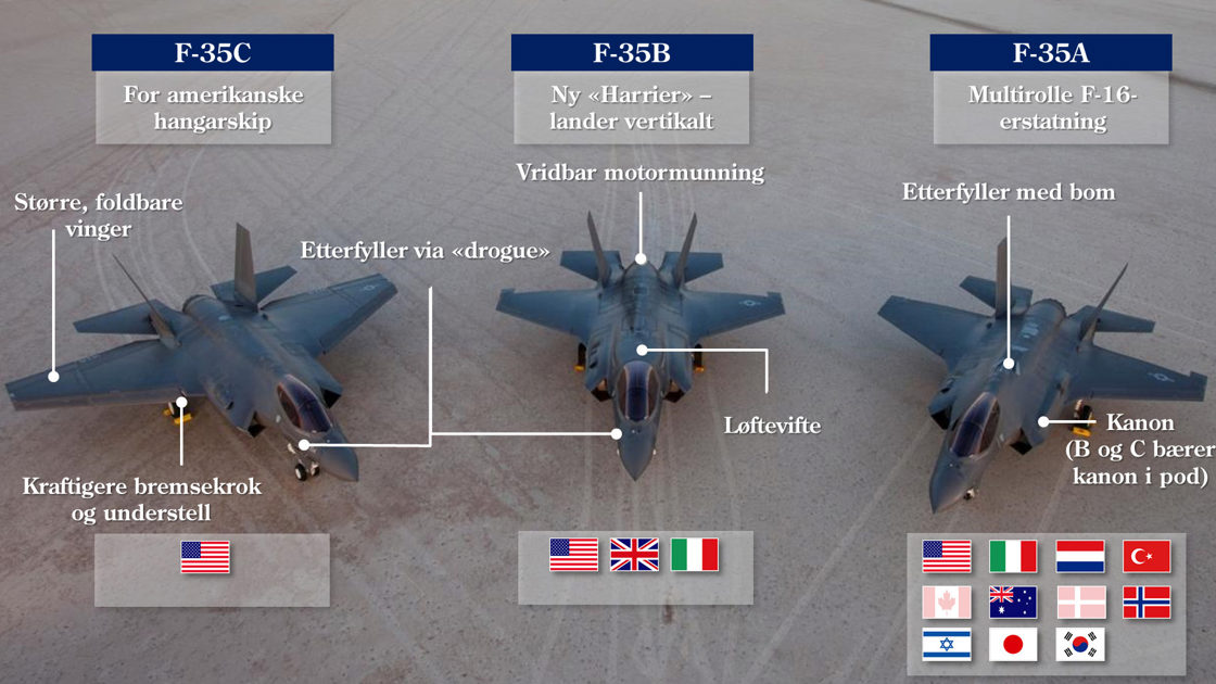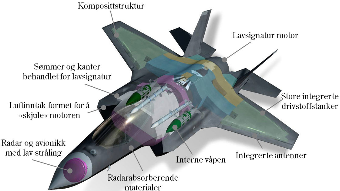 • Norge valgte F-35 som etterfølger til F-16 i 2008. • Enseters multirolle kampfly. • Produsert av Lockheed Martin i Fort Worth i Texas, USA. • Fløy for første gang i 2006. • Vekt: 13,3 tonn (tom) 31 tonn (maks) • Motor: Pratt & Whitney F135. Motorens skyvekraft: 40000 pund. • Drivstoffkapasitet: 8,3 tonn. • Rekkevidde: 2200 km (tilsvarende avstanden fra Oslo til sydspissen av Italia) • Våpenlast: opp til 10 ulike missiler og presisjonsstyrte bomber, hvorav 4 inne i flyet i egne våpenrom, totalvekt over 8 tonn.