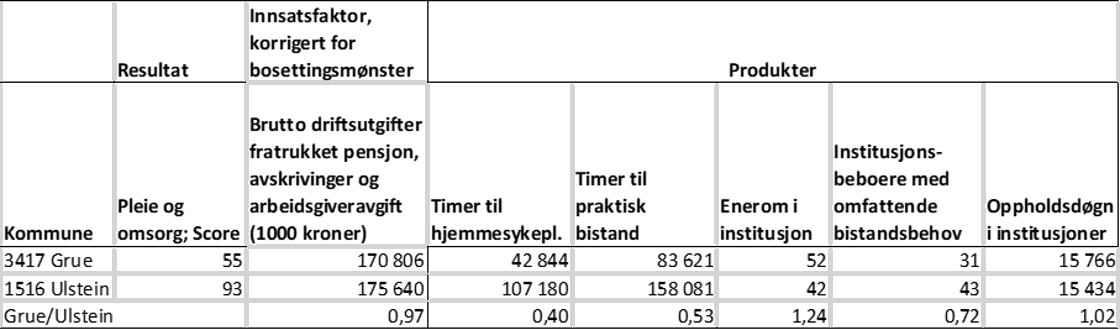 Grue og Ulstein har omtrent lik ressursbruk. Selv om produksjonen i Grue ligger noe over for enerom og oppholdsdøgn i institusjoner ligger produksjon vesentlig lavere når det gjelder timer til hjemmesykepleie, praktisk bistand og til dels institusjonsbeboere med omfattende bistandsbehov. Lavere målt effektivitet i Grue må ses i sammenheng med dette.