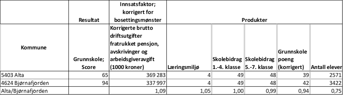 Alta kommune får score 65 for grunnskole. Vi finner at Alta kommune ligger i kommunegruppen "9. Kommuner med 20 000 til 29 999 innbyggere". I denne gruppen finner vi også Bjørnafjorden som har score 94 innenfor Grunnskole. Driftsutgiftene i Alta ligger 9 prosent høyere enn driftsutgifter i Bjørnafjorden kommune. Samtidig ligger antall elever 25 prosent under sammenliknet med Bjørnafjorden, noe som innebærer at produksjonen ikke er tilsvarende høyere som utgiftene. Også korrigerte grunnskolepoeng ligger noe under. Dette forklarer lavere målt effektivitet innen grunnskole i Alta kommune enn i Haugesund kommune.