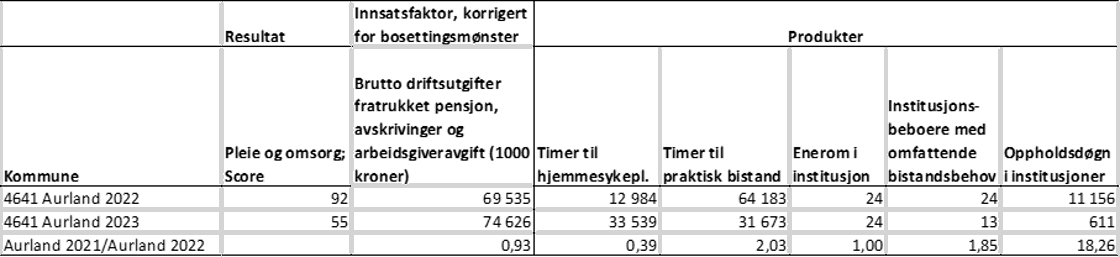 Tabell 4. Innsatsfaktor og produksjon i effektivitetsanalysen, omsorg 2022 og 2023. Aurland kommune.
