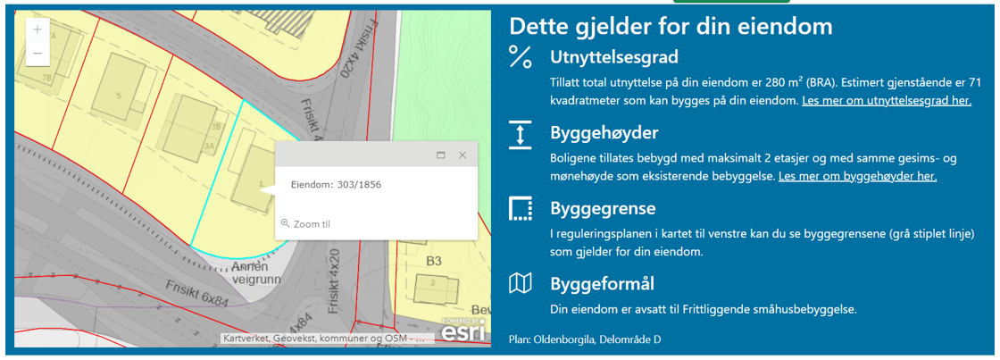Løsningene viser hvor mye av tomten som er registrert utnyttet, og sammenholder dette med utnyttelsesgrader i bestemmelsene. På denne måten slipper innbyggerne å måtte lete flere steder for å finne denne informasjonen.