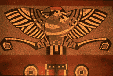 Stilistisk fugl i steinmosaikk Finnes flere steder i bygget, noe variert i gulvet. Denne er i gulvet innenfor hoveddøren.
