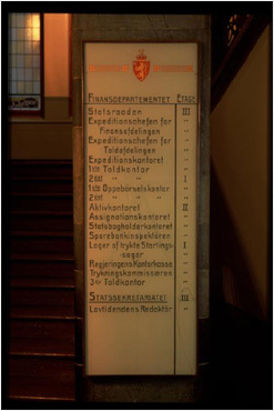 Informasjonstavlene fortsatt oppe Bygget har gjennom årene vært kontorlokaler for flere departementer. Pr. i dag er det bare Finansdepartementet som holder hus her. De gamle informasjonstavlene er intakte.