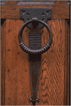 Details from the Main Entrance Wrought iron of old Norwegian patterns. There is a clear resemblance to the jewellery of Viking women, for example necklaces and bracelets.