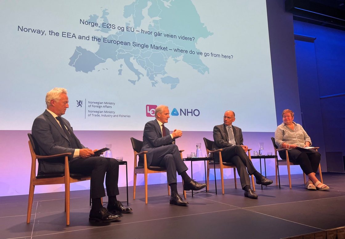 I'm particularly proud to see Enrico Letta and Line Eldring here. We're going to discuss the EEA and Norway's future on the best basis that Europe can provide: Two very solid pieces of work, looking ahead, looking into the past, looking into the present, to see where we come from, what is the future. – And there is no doubt about it, the Inner Market, Europe's future, is part of Norway's future, we are here; it's going to provide us with opportunities and challenges. – It is our Europe; this is the European market that we are part of today.