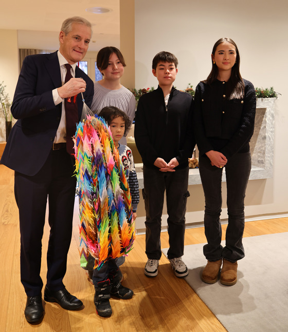 Before his meeting with the Nobel Peace Prize laureates, the Prime Minister was presented with 1 000 paper cranes folded by pupils at the Japanese school in Oslo. The paper crane is the logo of Nihon Hidankyo.