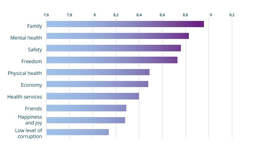 The survey also had a set of 42 aspects/areas of life, where respondents were asked to indicate how important each of the areas were for a good life on a scale from 0 (not important at all) to 10 (very important). The ten most important areas are shown in figure 7.