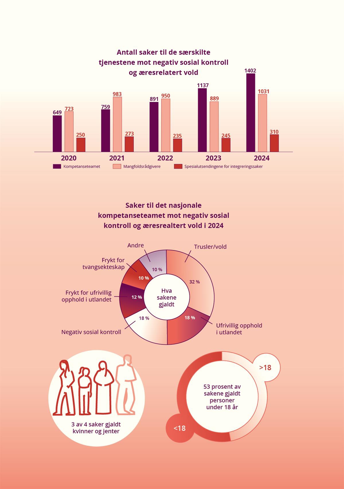 - The specialised services are important in the efforts against negative social control and honour-motivated violence. They are to prevent, identify and follow up on people at risk, and shall contribute to improving the competence of the service system. In order to lay the foundation for further development of the services, methods will be developed to document the specialised services’ guidance and competence enhancement efforts. It will also be considered how services can best meet the needs and rights of victims.