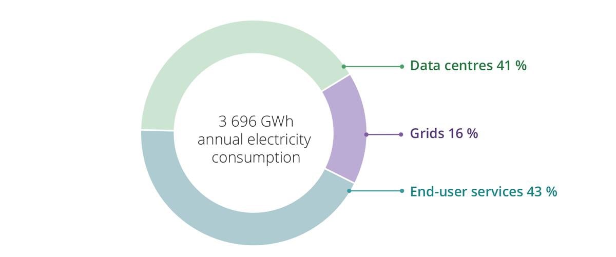 The total electricity consumption for digital infrastructure in Norway in 2024 is estimated at 3.7 TWh in Nkom’s sustainability analysis (see section 5.2), which represents 2.6 per cent of Norway’s total electricity consumption of 140 TWh. 6 The figure below illustrates the distribution of total electricity consumption across various parts of Norway’s digital infrastructure. As the figure shows, data centres accounted for around 41 per cent of this consumption.