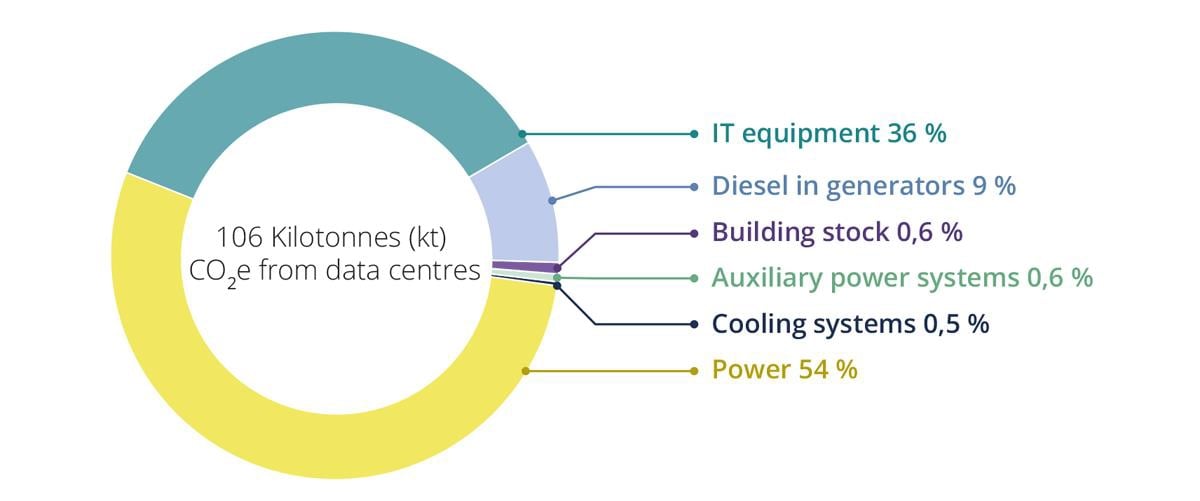 Data centres accounted for 9 per cent of the total climate footprint, with 106 kilotonnes of CO 2 emissions in 2024, and are expected to increase the most towards 2050. As shown in the figure below, energy consumption in the form of electricity (reuse of excess heat is not taken into account) and IT equipment (servers, storage capacity and network equipment) accounted for most of the emissions from data centres, at 54 and 36 per cent, respectively.