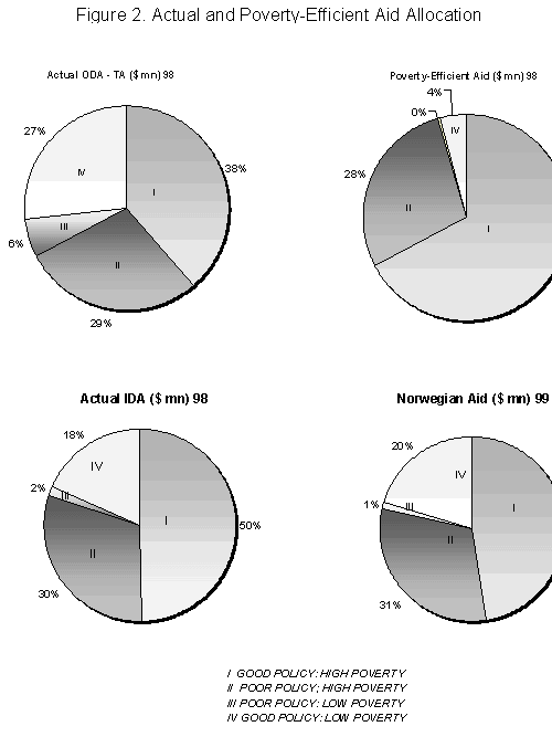 two years, however, there has been a notable change in donor behavior, in the direction that we have advocated. Some poor policy countries such as Kenya have seen clear cuts in their aid receipts. Nevertheless, it can be seen in Figure 2 that the allocation of total ODA in 1998 was far from the "poverty-efficient" allocation. Countries in quadrant I received more assistance that those in quadrant II. However, donors in the aggregate continue to give a lot of assistance to middle-income countries in which aid is not likely to have much impact on poverty.