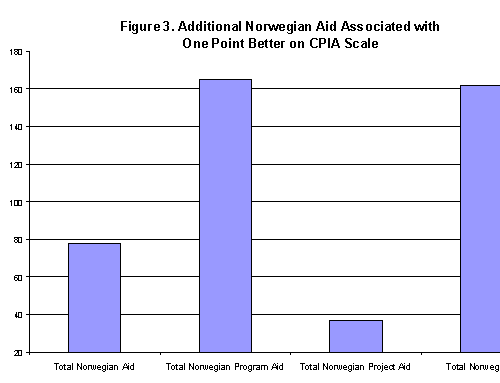 A second approach to analyzing the general efficiency of Norwegian aid is through regression analysis. The poverty efficient model says that aid should be allocated on the basis of a country’s poverty and its policies. In appendix table 1 we regress Norwegian aid on per capita GDP, population, and the CPIA index. (Here we use all the data from the 1990s and create a panel.) After controlling for per capita income and population, there is a clear relationship between how much aid a country gets from Norway and its policy as measured by the CPIA. This relationship is summarized in Figure 3, which shows how much additional Norwegian assistance is associated with a one point increase in the CPIA. (One point is a fairly large change in the index; the standard deviation of the index is 0.7. One point is roughly the difference between Kenya’s policies and Uganda’s policies.) One point better on the CPIA scale is associated with 78% more Norwegian assistance. The t-statistic on that coefficient is 4.92, so that the relationship is quite a significant one. It is interesting to carry out the same exercise for some of the different components of Norwegian assistance. The relationship with the CPIA is particularly strong for program aid (165% more for a one-point change in the index) and also for technical assistance (162% more). For project aid, one point on the CPIA is associated with 37% more aid, though that number is not statistically different from zero. These findings suggest that Norway uses its program aid and technical assistance to support poor countries that have reformed, while continuing to pursue projects in all types of policy environments.