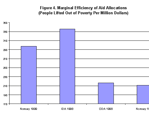 We estimate that an additional million dollars of Norwegian aid would lift 298 people permanently out of poverty. One has to recognize that a specific point estimate like this has quite a bit of uncertainty around it. Nevertheless, it is a useful, broad estimate that is quite plausible. It says that it takes an investment of around $3,000 to permanently lift someone out of poverty. Figure 4 shows how this marginal efficiency of Norway’s 1999 assistance compares to other donor allocations. Norway’s aid is about 50% more productive – in terms of poverty reduction – than average ODA. It is not quite as efficient as 1998 IDA, which has an estimated marginal productivity of 336 people per million dollars. Furthermore, the efficiency of Norway’s assistance improved over the decade, from 211 people per million dollars in 1990. (In other work we estimated that the marginal productivity of ODA overall in 1990 was quite low, about 100 people per million dollars.) Thus, Norway’s assistance is more poverty efficient than ODA in general and has improved over the decade. As noted, the specific point estimates should be treated with some caution. However, the basic finding that Norwegian aid is more productive than average ODA is quite robust.