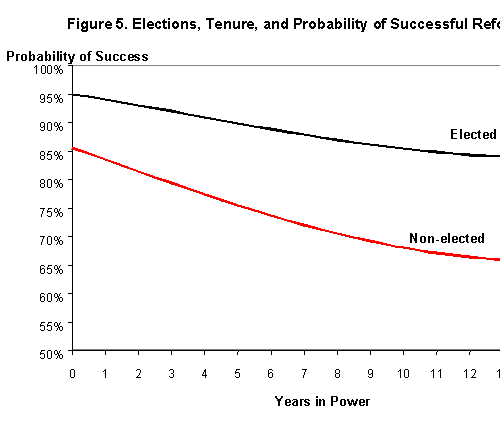What Dollar and Svensson find is that the outcome of reform programs can be predicted quite well by information on the recipient country's characteristics that is available before the reform starts. For example, the success rate for new governments is far higher than the rate for governments in power for a long time. On top of that, the success rate was higher for democratically elected governments. These two findings are put in terms of the probability of success of a reform program in Figure 5: a new, democratically elected government has a 95%