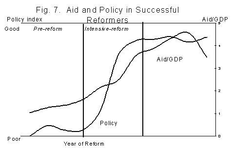 Figure 7 shows the pattern of aid and policy for the three successful low-income reformers, Ghana, Uganda, and Vietnam: small amounts of assistance (and no adjustment loans) when they had bad policy; and then sharply increasing finance associated with adjustment loans as they put in place major reforms. The Ghana and Uganda case studies argue that this pattern of assistance had several advantages. First, during the poor policy period assistance focused on policy dialogue and technical assistance. In this period, the governments were searching for their basic policy orientation, and they did some experimentation. It was useful in this case not to have adjustment loans tying the government to plans -- the government was still searching for its plans. Low level assistance without conditionality can help that learning process (which involves studying other countries and trial and error). Once Ghana and Uganda moved decisively to put policy reforms in place, it was important to have the increasing finance, which helped bring forth a strong response from the reform program: it is important that citizens see the benefits of reform quickly, and aid increasing in lock-step with policy improvements helps in this way: