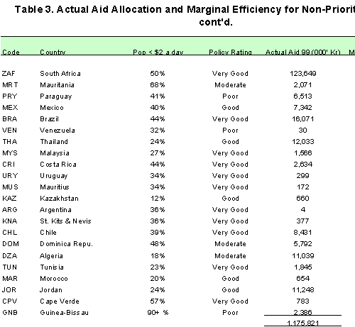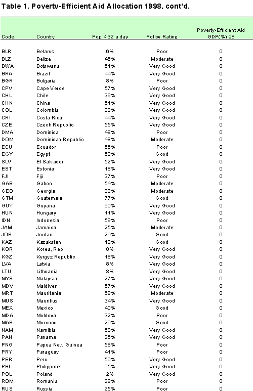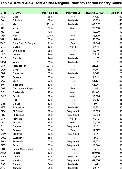 In general, very populous countries such as Bangladesh and Ethiopia are under-funded in terms of aid. Thus, in the poverty-efficient allocation, Bangladesh would get about half the total, where in reality it gets about 13%. There are political reasons why donors may not want to concentrate too much assistance in any one country. In the cases of Bangladesh and Ethiopia, there are other factors as well. Reallocating a large amount of aid to Bangladesh would essentially mean taking it from African countries. And, in the case of Ethiopia, the recent war with Eritrea is another consideration. The policy score used here is for 1999. Realistically, the war is a factor that increases military expenditure as a proportion of the budget, thereby probably reducing the poverty-efficiency of aid. Further, the recent war raises political considerations beyond the scope of our analysis but of legitimate concern to donors.