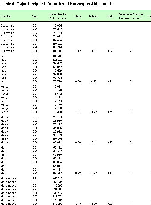 The countries in the Phase IV list have weak policies and governments that have been in power a long time. We emphasize that there is an element of subjectivity in creating these lists. The executive in Zimbabwe has been in power for 20 years and the country has really poor policy; so too for Kenya (22 years, actually). We feel quite comfortable saying that these are low probability reforms and low aid effectiveness countries. In the cases of Zambia or Mozambique, on the other hand, the governments have been in power less long (9 years for Zambia and 14 for Mozambique) and policies are in the moderate range – not truly good, but better than those of Kenya or Zimbabwe. For both Mozambique and Zambia, Norway has reduced its aid as the decade has proceeded, and that seems a reasonable reaction to the slow progress with reform.