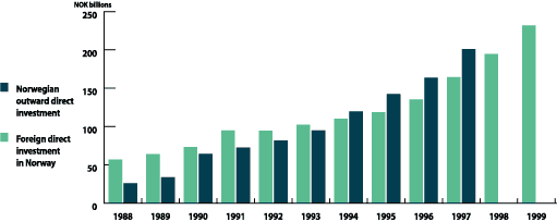 | Source: Statistics Norway (exports by type of goods, two-digit SITC) Direct investments in companies in Norway/abroad - expansion abroadForeign capital and foreign direct investments in Norwegian companies have been of great significance to the growth of Norwegian industry. The figure below shows that Norwegian investments in foreign companies are now greater than foreign investments in Norwegian industry. Prior to 1994, the situation was the opposite. Norwegian investments abroad have risen strongly over the past decade, and a significant amount of the expansion that has occurred has taken place there. Direct investments have primarily been in the manufacturing industry, and the reasons given for them are often the desire to have access and proximity to new markets, access to knowledge and technology, and access to and the ability to utilise natural resources and reasonably priced labour. A survey conducted by SNF of a selection of Norwegian companies’ activities abroad in 1996 showed that the largest Norwegian companies had 150 000 employees in their subsidiaries abroad (43 per cent of all the companies’ total employees). This is equivalent to around 40 per cent of those employed in manufacturing goods in Norway (with the exception of agriculture). Seventy-six per cent of these companies’ total revenues came from outside Norway. |