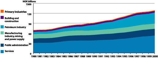 | Source: Norges Bank Value creation over the past 20 yearsThe gross domestic product, or GDP is a measure of the value creation in all the goods and services produced by a country in the space of a year. In 2000, Norway’s total GDP came to NOK 1 424 billion. The private-services sector accounts for 40 per cent of Norway’s GDP, making it the highest contributor. The number employed in the service industries has also grown by 230 000 since 1980. The increase in those employed in business services has been all of 240 per cent. The manufacturing industry accounts for around 9 per cent of the GDP of mainland Norway. The number of people employed in this sector was falling at the beginning of the 1980s, and was around 300 000 in 2000. The estimated value creation in general government currently comprises around 14 per cent of the GDP. Since 1980 and up to the present day, the number of people employed in general government has increased by 250 000, with more than 90 per cent of this growth taking place in local-authority administration. The primary industries account for around 2 per cent of Norway’s GDP. Private services and oil production have been the most important contributors to the growth in GDP over the past 20 years, while the value creation in the manufacturing and construction industries has mainly remained stable throughout this period. Development in GDP by industry, 1980-2000 (fixed 2000 prices) |