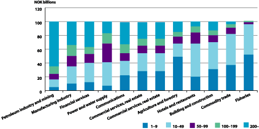 | Source: Statistics Norway, Register of Companies and Business Enterprises Some key bodies in the industrial-policy systemThe Norwegian Industrial and Regional Development Fund (SND) has, since its formation on 1 January 1993, been an important source of financing for small and medium-sized companies. The SND is the authorities’ key body in the field of industrial and regional development, and focuses on small and medium-sized companies, new companies, competence-increasing measures and female participation in industry, among other things. The Research Council of Norway (NFR) administers almost NOK 3 billion for research purposes, provides advice on research-policy questions and creates meeting places for researchers and users of research. The objectives of the Research Council are to promote basic and applied research in all professional fields, increase society’s level of knowledge and promote creativity in all sectors and industries. The Norwegian Trade Council is intended to be Norway’s national centre of expertise on exports, internationalisation and technological collaboration. Norwegian Industrial Attachés (Norges Industriattachéer) were incorporated into the Norwegian Trade Council as from 1999. The Norwegian Tourist Board is a commercial foundation established in collaboration between the Norwegian government and the travel industries in Norway. This foundation is intended to be a national, professional marketing body for the Norwegian travel industries, and must, through its work, contribute to stimulating and strengthening the travel industries’ overall profitability and competitive ability. The Norwegian Guarantee Institute for Export Credits (GIEK) is the main government body for providing guarantees and insuring export credits. Its main goal is to promote the export of Norwegian goods and services and Norwegian investments abroad.