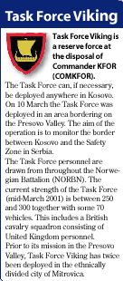 It is usual for the Lead Nation to place an operational reserve force at the disposal of the Commander KFOR. This is a reserve intended for use in situations that require a rapid response. Norway now leads such a force, which has been named Task Force Viking. This force is lead by the commanding officer of the Norwegian KFOR Battalion (NORBN) and consists mainly of a Norwegian infantry company (about 200 men) and a British cavalry squadron.