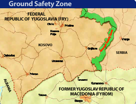 The withdrawal of forces from Kosovo was in accord with the Military Technical Agreement concluded between NATO and Yugoslavia (FRY) on 9 June 1999. The Agreement was signed by Lieutenant General Michael Jackson on behalf of NATO, and Colonel General Svetozar Marjanovic on behalf of Yugoslavia and Serbia. The Military Technical Agreement deals with the Serb withdrawal and KFOR’s role in Kosovo. The Agreement provided for a 5 kilometer wide Ground Safety Zone (GSZ) and a 25 kilometer wide Air Safety Zone (ASZ) along Kosovo’s border with Yugoslavia. These zones were established to rule out the possibility of direct contact between Serb forces and KFOR.