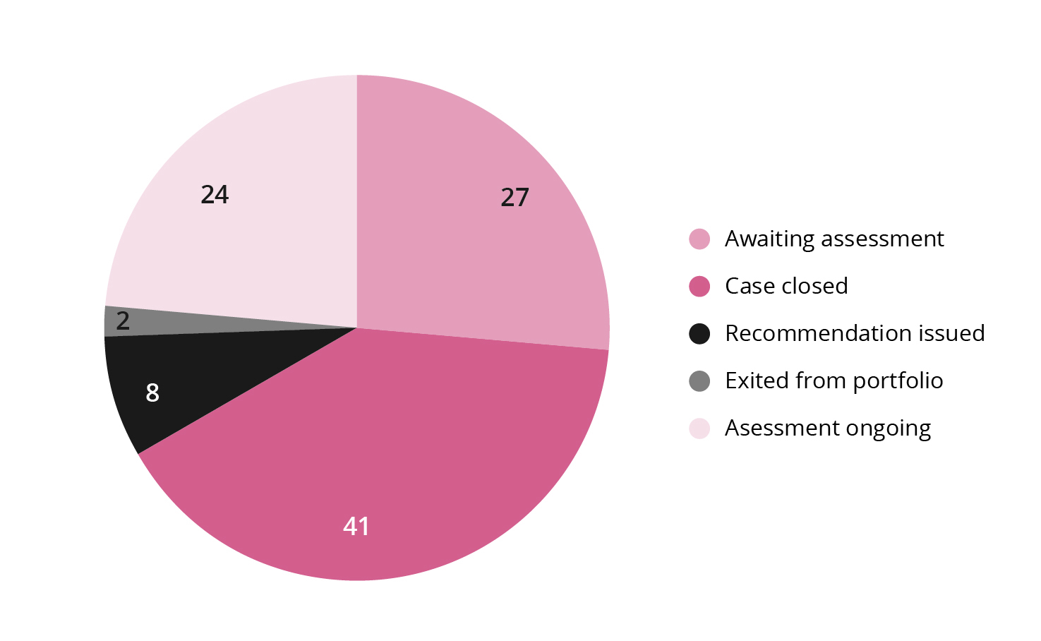 Fig. 2.1 shows how the 102 cases opened for assessment in 2023 were dealt which. The majority of cases do not end in a recommendation to exclude a company or place it under observation, but are shelved at an earlier stage in the assessment process. With respect to the 102 new cases in 2023, eight resulted in recommendations to exclude or place a company under observation, or to terminate a company’s exclusion or observation period, while 41 were shelved. The assessment of two new cases was terminated because the companies were no longer in the portfolio, 24 cases are still under assessment, while the assessment of 27 cases has not yet commenced.