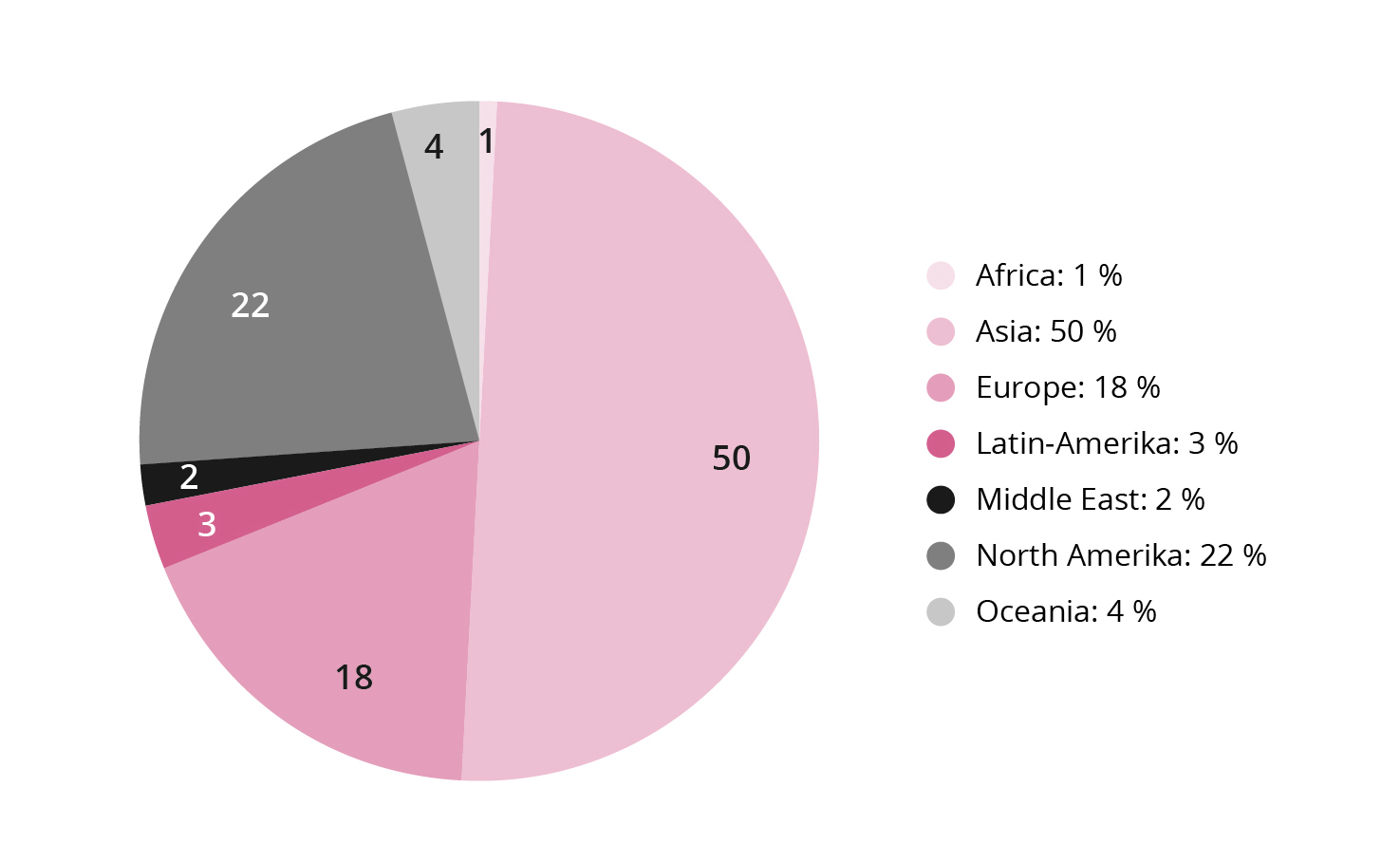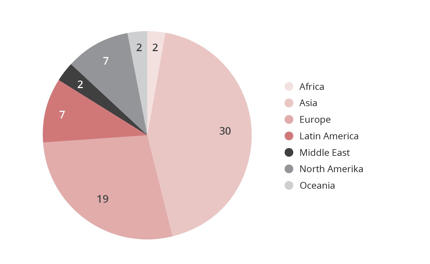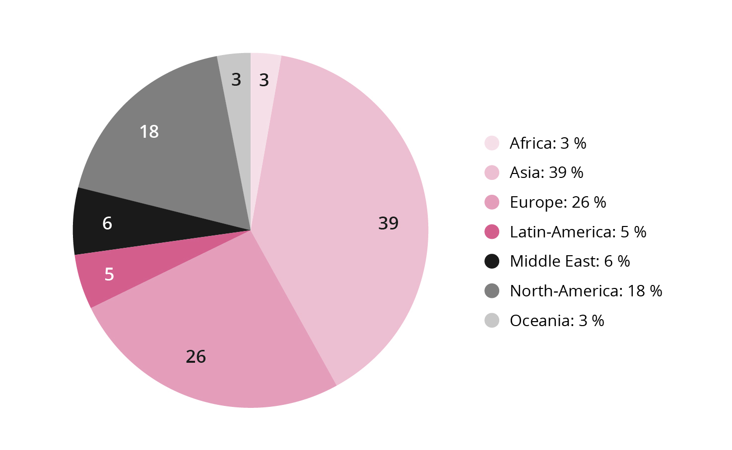 Regional distribution of the companies assessed by the Ethics Council in 2023. Companies from Asia make up 39 %, 11 % less than the share of the investments. Companies from Europe 26%, 8% more than the share of investments,. North America is underrepresented, while the Middle East is overrepresented.