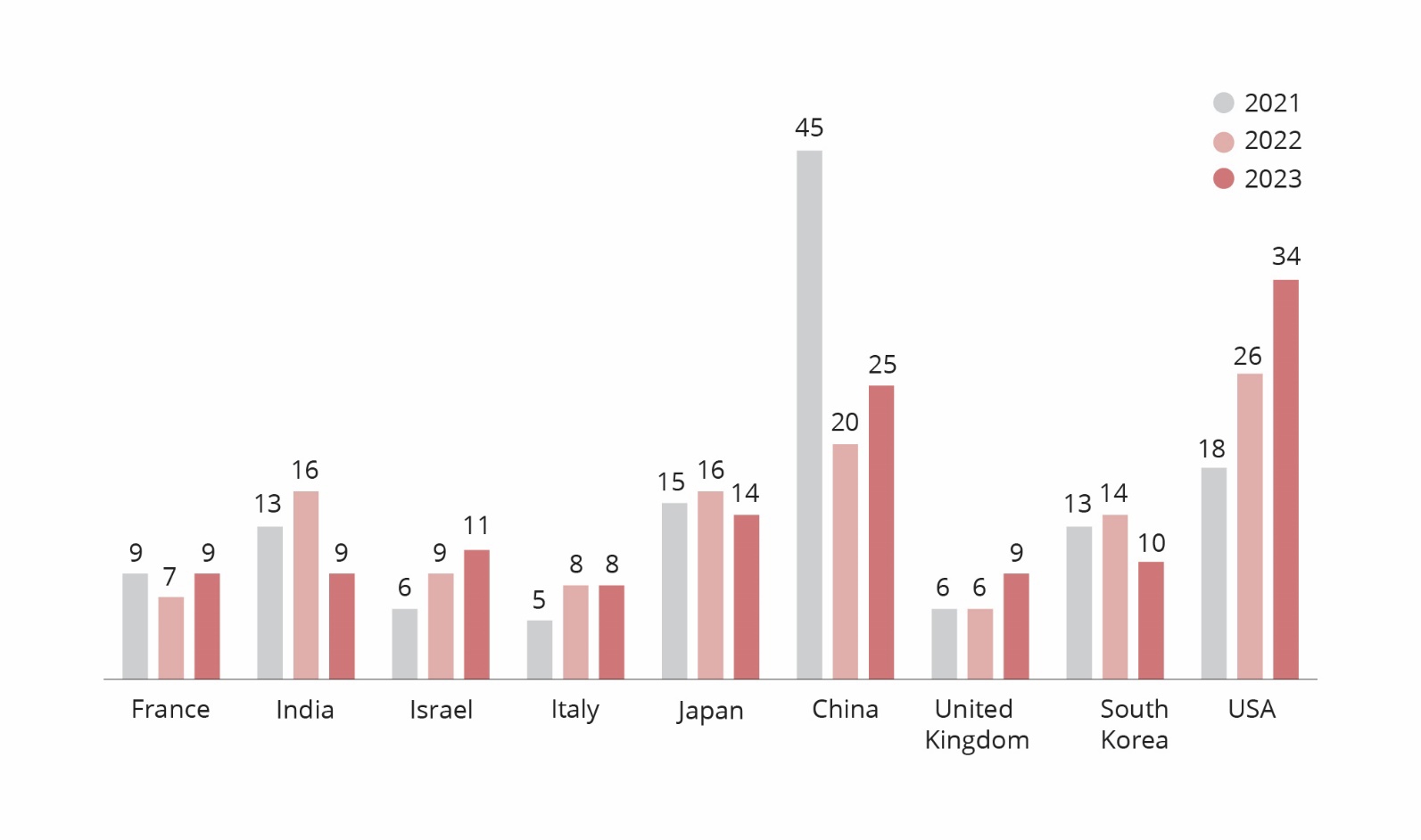 Fig. 2.4 shows the number of companies under assessment in 2021, 2022 and 2023 from the nine countries from which most companies under assessment in 2023 were drawn. In 2022, Malaysia was included in a similar presentation.