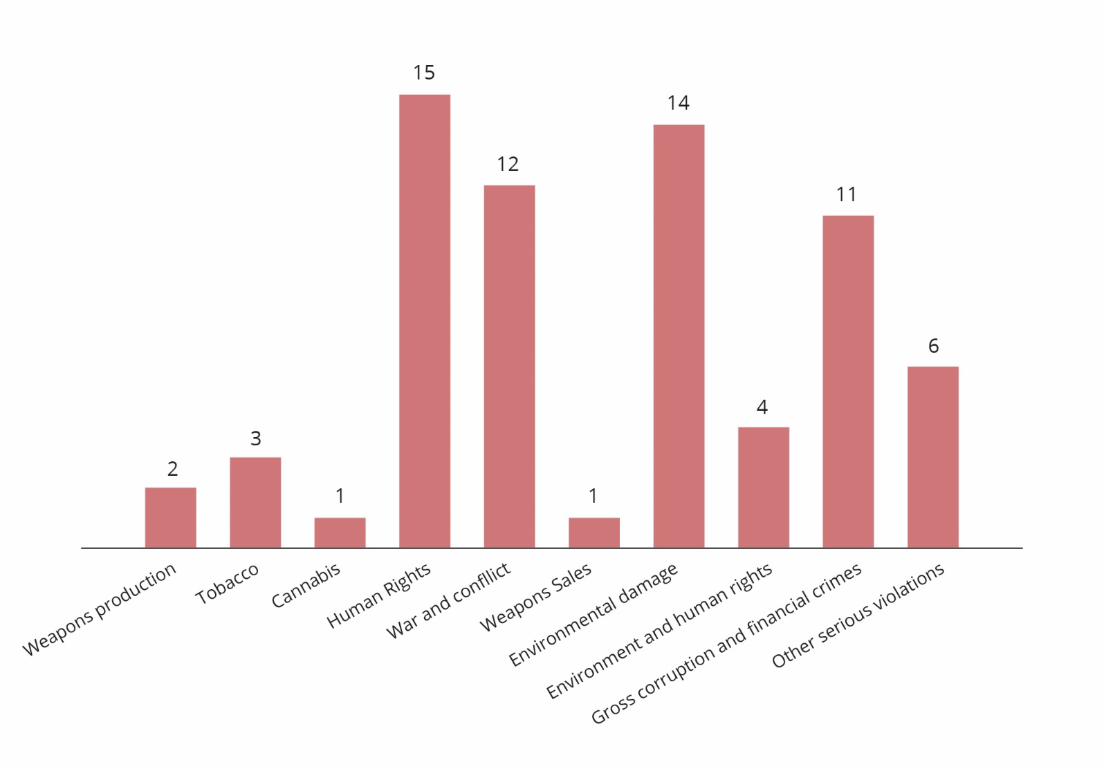 Overview of how the Ethics Council's work has been distributed among the various exclusion criteria in the period 2021–2023. The human rights criterion stands out with the most cases, followed by corruption.