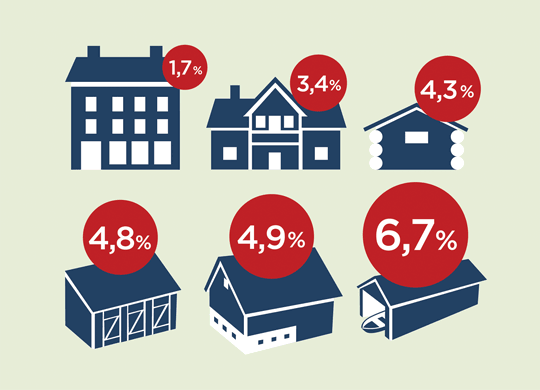 The figure shows the losses in certain categories of building in the period 2015–2019. Boathouses and fishing sheds have the highest rate of loss, at 6.7 per cent. Farm buildings are being lost at a rate of almost 5 per cent, while smaller outbuildings and mountain summer grazing farms / buildings in uncultivated areas have had a loss rate of well over 4 per cent in the last five years. In 2005–2010, farm buildings and mountain summer grazing farms / buildings in uncultivated areas had the highest loss rate, at 6.3 per cent and 6.8 per cent, respectively.