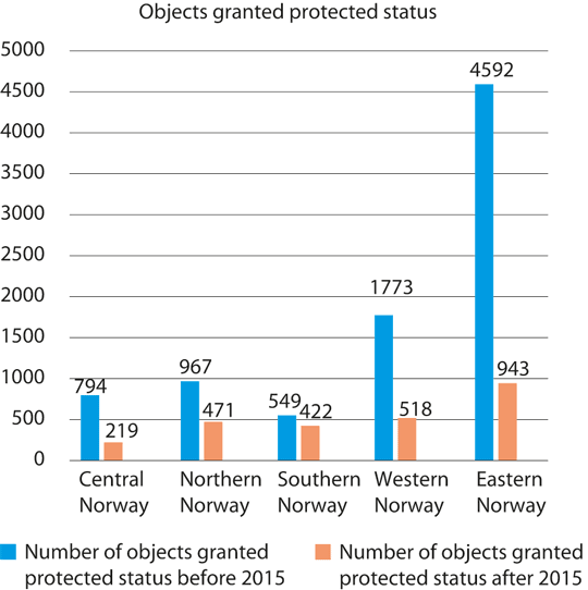 The Directorate for Cultural Heritage’s protection strategy from 2015 has formed the basis for work on granting protected status. The purpose of the strategy is to ensure a more representative selection of protected monuments and sites. To this end, priority has been given to completing the processing of ongoing applications for protected status. An overview of approved and initiated applications for protected status since 2015 shows that the geographical spread has improved. Improvements have also been seen in several categories of cultural monuments, sites and environments that have been given priority in the strategy, and which have previously been underrepresented. Stricter prioritisation of which applications for protected status are initiated and more efficient processes, including owner involvement, better guidance, and follow-up of cases, have yielded results.