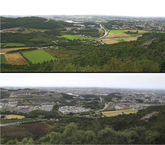 The European Landscape Convention does not place any restrictions on the use of the landscape. However, the Convention stresses the importance of taking note of changes and steering the changes in the desired direction. These two photographs of Høyland-Bogafjell in the municipality of Sandnes demonstrate how the landscape can change dramatically in a relatively short period of time. These two photographs were taken only 18 years apart.
