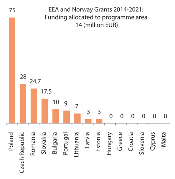 Figure 12.4 The EEA and Norway Grants for Programme Area 14 in the period 2014–2021, broken down by beneficiary country.