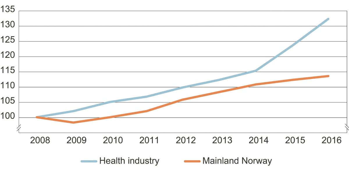 Value creation in the health industry constitutes around three per cent of Norway’s mainland economy. In recent years, growth in the health industry has exceeded growth in the mainland economy. The health industry employed around 100,000 people in 2016, an increase of 18 per cent since 2008. The growth in employment has been lower than the growth in value creation, which means that the value creation per employee has increased.