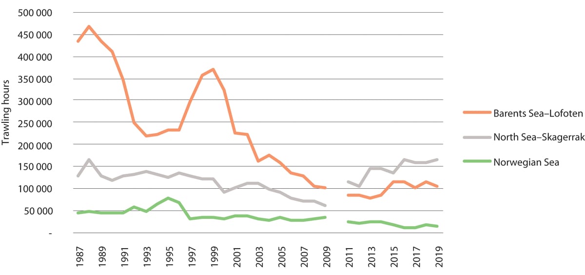 Rising sea temperatures and greater inflow of Atlantic water are the main reasons for the northerly shift in the distribution of fish stocks. It appears likely that the focal point for important Norwegian fisheries will shift northwards and eastwards in coming years. As the sea ice melts, previously inaccessible areas are likely to become accessible for fishing. It will be important to carry out specific assessments of which areas can be opened for fisheries, and where the presence of valuable and vulnerable areas indicates that this should not be done.