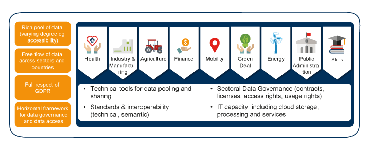 An important task in realising the objectives of the data strategy is the establishment of a framework for nine European data spaces in key sectors. These are: health, industry and manufacturing, agriculture, banking and finance, mobility, European Green Deal, energy, public administration, and skills; see figure 3.1. The framework for the data spaces will comprise standards, tools, and infrastructure for storing, processing and sharing data both within and between EU member states. The framework should also give data managers and users the rights, tools and skills to have control of their own data.