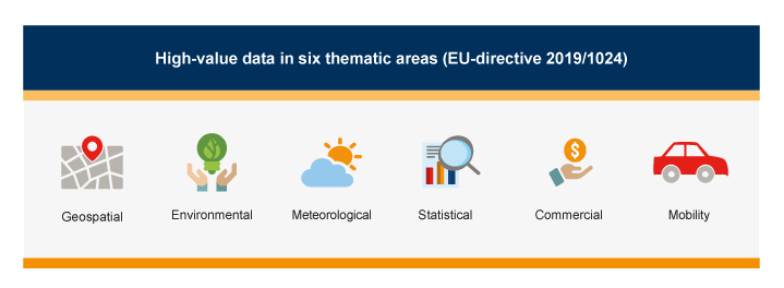 An important body of rules for the data-driven economy comprises what are referred to as the Reuse Directive and the PSI Directive (Public Sector Information Directive).3 The directives set out how public sector should share data which can be used to create value. In 2019 these directives were replaced by a new directive on open data and reuse of public sector information, known as the Open Data Directive (ODD).4 The purpose of the amendments in the directive is to make public sector information more widely available free of charge or at marginal cost. The directive defines six thematic categories where use of public sector information has major benefits for the economy and society, known as ‘high-value datasets’; see Figure 3.2 The work on identifying which datasets should be included in this category is currently being conducted in the EU/EEA, and Norway is participating in this work.