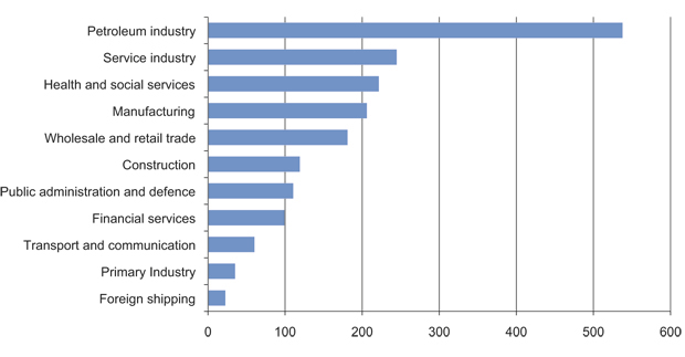 The petroleum activities create jobs throughout the country through oil companies, the supply industry, research and education institutions and other related activity. Employment in companies whose production mainly targets goods and services for the petroleum industry is around 43,0002. According to a report issued by Statistics Norway3, around 8 per cent of Norwegian employment, or more than 200,000 jobs, are directly or indirectly linked to demand from the petroleum industry.