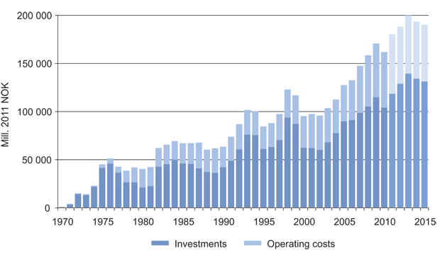 Figur 2.10 Historical investments and operating costs from 1971 to 2010 and forecast to 2015.