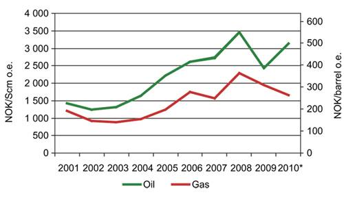 Prices achieved for oil have historically been higher than for gas, cf. Figure 2.12. The combination of reduced oil production, increased gas production and lower relative sales value for gas will impact cash flow from the petroleum activity. Income from the sector will fall more sharply than total production would indicate. Increased oil production will lessen this effect over the short and medium-term, while exploration and discoveries in new areas on the shelf can help maintain significant revenues, also over the long term.