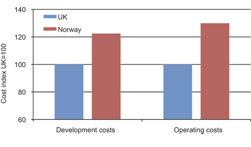 On assignment from the Ministry, the consultant firm Wood Mackenzie compared costs on the Norwegian Shelf with other relevant petroleum provinces for the exploration, field development and operations. The study confirms a higher cost level in Norway than in comparable countries. When comparing the Norwegian and the UK shelves, Wood Mackenzie found that both development costs and operating costs are more than 20 per cent higher in Norway than in the United Kingdom, cf. Figure 2.17. The difference is in part due to activity associated with production drilling, including the cost of hiring rigs and drilling equipment. Higher prices for subsea services and process facilities also contribute to more expensive developments on the Norwegian Shelf. Taxes (CO2 and NOx) also contribute to higher operating costs. Costs associated with transport of oil and gas have not been part of the study.