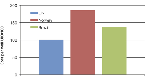 Norway also emerges as a high-cost country when it comes to exploration activity, cf. Figure 2.18. The cost of drilling exploration wells on the Norwegian Shelf in waters shallower than 400 metres are about 85 percent higher than on the UK Shelf and 35 per cent higher than on the Brazilian Shelf. Hiring of rigs and associated personnel, field evaluation and other administration are the most important explanations for the cost differences.