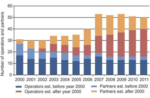 Figur 2.19 Number of operating companies and licensees divided between companies established before and after 2000.