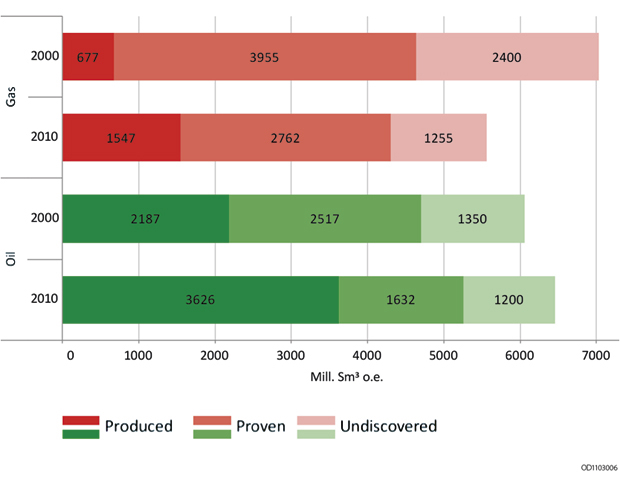 The resource base and the assessments of the resource base change over time. Resources are matured through several phases, finally ending in production. New knowledge about geology and reservoir conditions changes the assessment of the resource base. The current picture of the resource base is considerable different than the picture we had just ten years ago, cf. Figure 2.2. The estimate for undiscovered resources, particularly gas, was reduced in 2011.