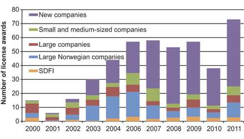 The Norwegian authorities therefore implemented a number of measures to enhance value creation from mature areas. A key measure was to allow other companies to become licensees. Small and medium-sized oil and gas companies, along with foreign downstream companies, was established on the continental shelf, as did a number of new Norwegian companies, cf. Figure 2.19.